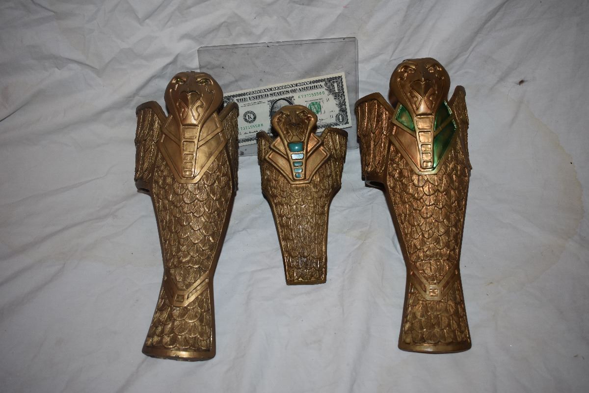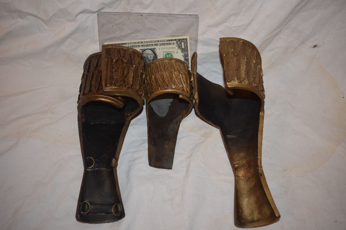 Description: "These are KAHMURAH'S gauntlets from NIGHT AT THE MUSEUM 2. There are the set of SCREEN USED ones, and a fiberglass casting of the larger one. You can see how one strapped on and the other was glued."[15]