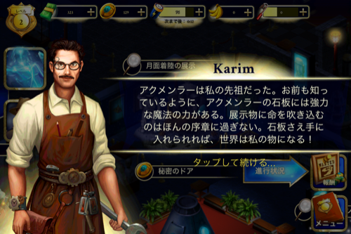 Teddy is the first character to be unlocked, followed by Sacajawea, Octavius, Jedediah, an Einstein bobblehead, Attila, and an original character named Karim. Karim is one of Ahkmenrah's descendants, and eventually revealed to be the game's antagonist. He takes the exhibits hostage, and attempts to flee with the tablet's magic for himself.[4]