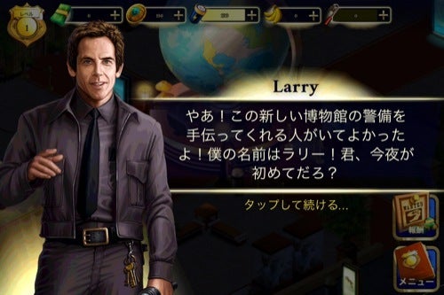 The game is set in a fictional museum that's a cross between the AMNH, Smithsonian, and British Museums, featuring levels based on exhibits from all three movies of the LAT. The protagonist is a new night guard at this museum being mentored by Larry. At the beginning, you only have the front desk, but quickly unlock the Wild West and Age of the Dinosaurs. Tilly works at the Lost and Found desk, and by playing the game, you can turn items in to her desk to receive prizes.