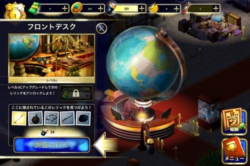 | Front Desk | A view of the main entrance area, with the computer and globe in the foreground and Rexy in the background. Rexy is closer to the desk than in the films. | Keys, Leather Bag, Handcuff, Pen, Glasses, Magnifying Glass, Coffee Cup |